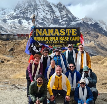 Setena etapa, etapa reina. Avui és el gran dia, avui passarem els 4.000m d'alçada i arribarem al Camp Base sud de l'Annapurna. Iniciem l'ascens fins al Machhapuchre Base Camp, itinerari que ja coneixem d'ahir, on ens aturem a prendre un tè ben calent. Des d'aquí abandonem el curs del riu Modi, tombem a l'oest i caminem paral·lelament a l’immens glaciar que neix als peus de l'Annapurna. L'alçada es nota i l'avanç es ralentitza. A l'esquerra el Hiunchuli, al davant l'Annapurna Sud i a la dreta el Tharpu Chuli; paisatge i perspectiva totalment diferent als dies anteriors. Comencem a veure el campament al fons, ja queda menys! Superem els 4.000m d'alçada i poc a poc els integrants del grup van arribant als peus del cartell que ens dona la benvinguda al Santuari de l'Annapurna (4.130m). Amb les emocions a flor de pell, l'alegria és màxima i compartida, ho hem aconseguit! Tot el grup ha superat amb nota la prova, ara toca descansar i gaudir de les vistes i de la posta de sol. Tot i l'espectacularitat de l'entorn, l'Annapurna se'ns resisteix i s'amaga durant tot el dia darrera un vel de niguls, tocarà creuar els dits i esperar...